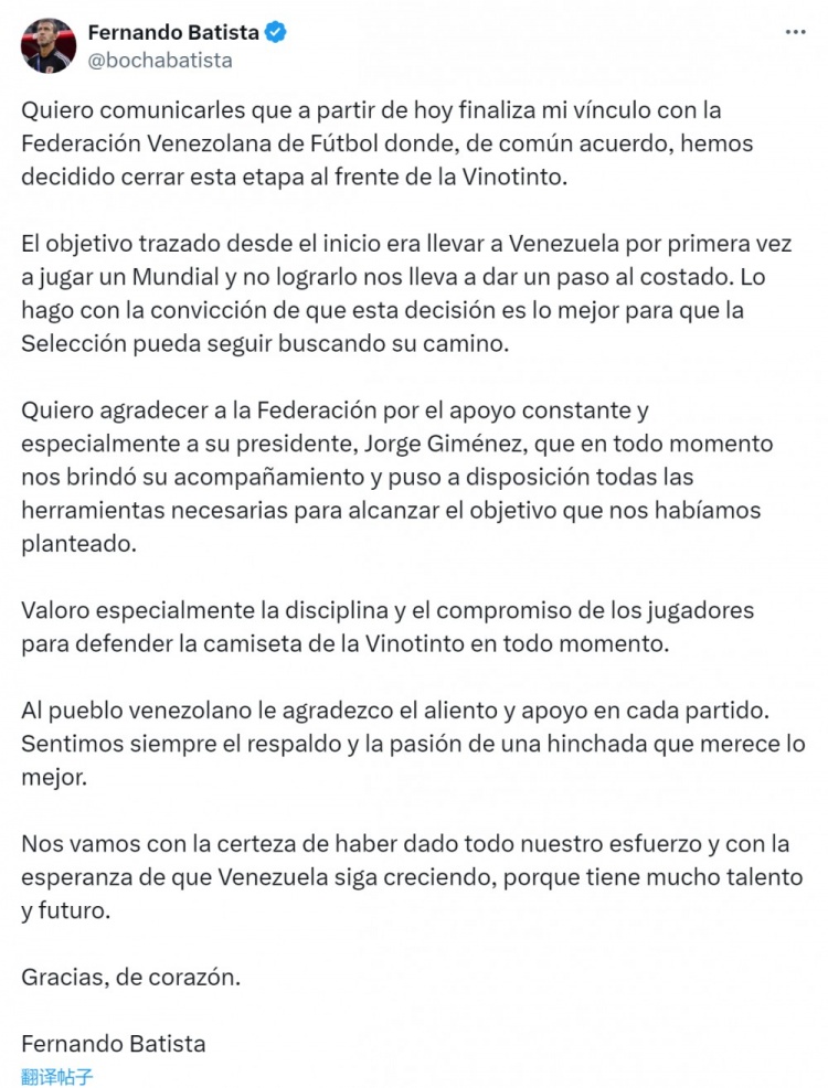 9月11日讯 委内瑞拉南美世预赛未能出线,主帅费尔南多-巴蒂斯塔离任,巴蒂斯塔社媒发文告别。